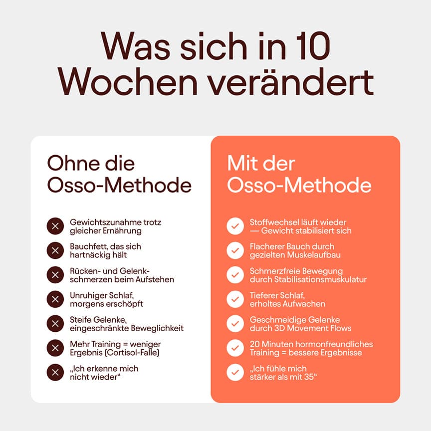 Und genau deshalb funktionieren die üblichen Strategien nicht mehr. Mehr Joggen? Erhöht Cortisol — das Stresshormon, das Fetteinlagerung am Bauch fördert. Weniger essen? Beschleunigt den Muskelabbau und bremst den Stoffwechsel noch weiter aus. Du trainierst mehr und erzielst weniger.