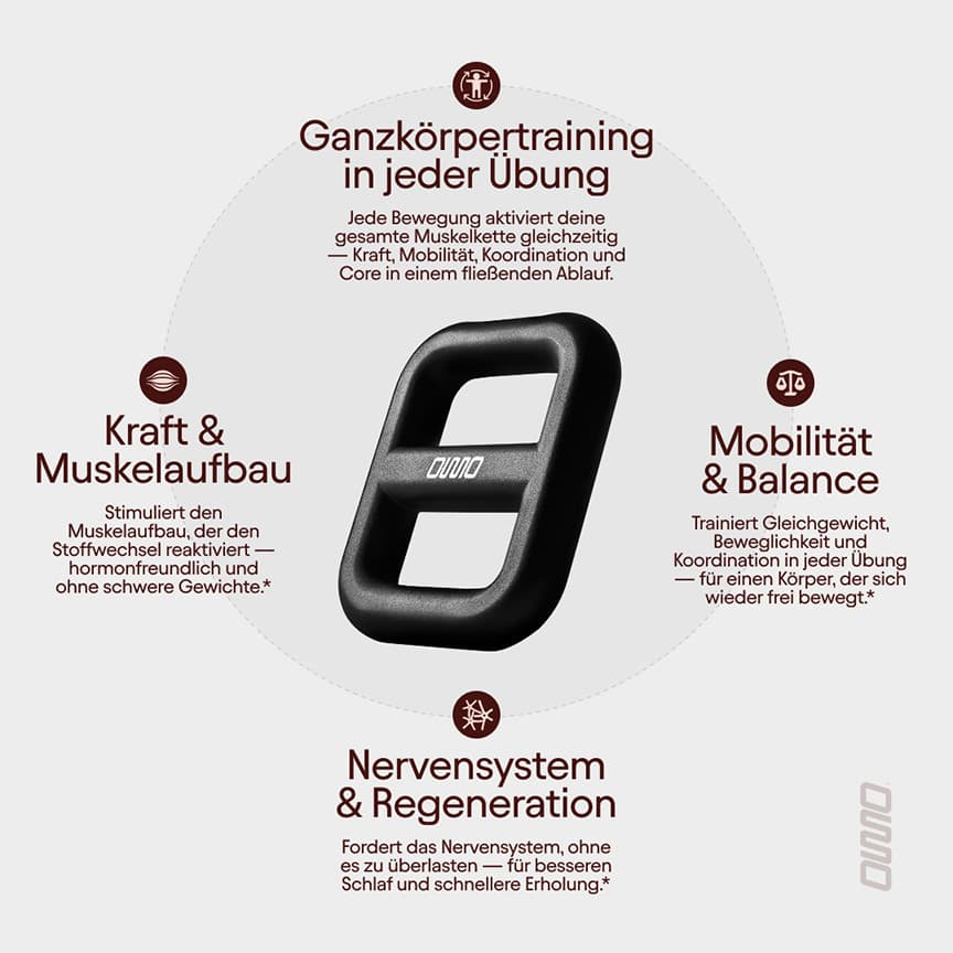 Die Osso-Methode setzt genau hier an. Das Training basiert auf funktionellen Movement-Flows mit dem patentierten Trainings-Tool. Statt einzelne Muskeln zu belasten, trainierst du Bewegungsmuster, die du im Alltag brauchst.