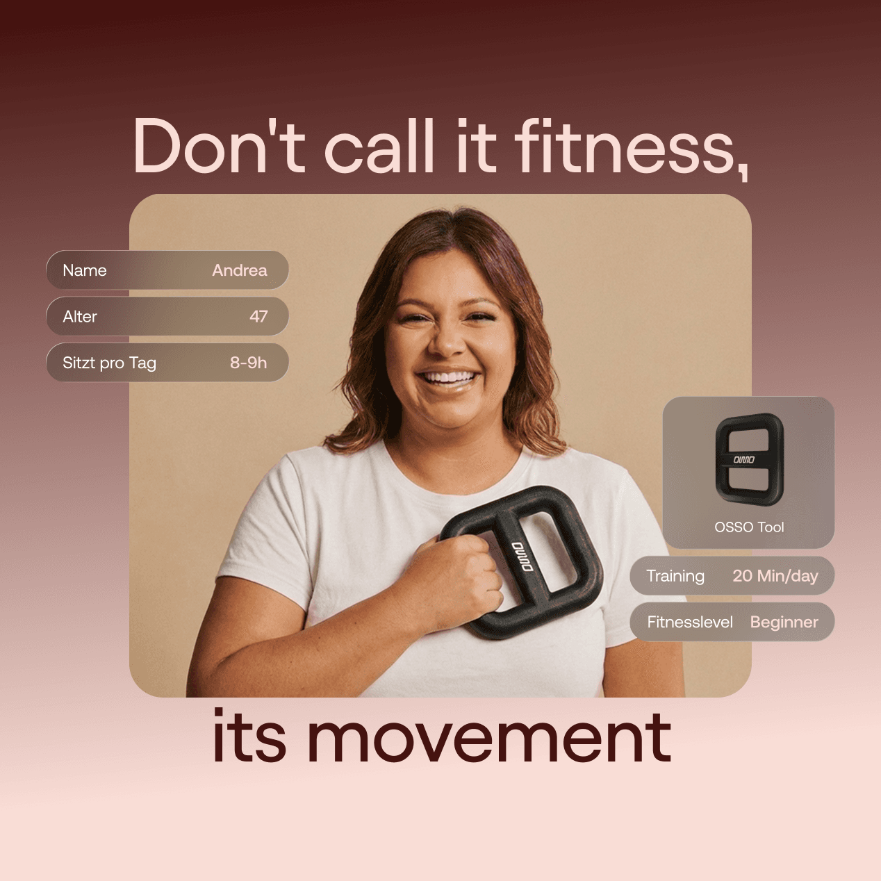 Die Osso-Methode setzt genau hier an. Das Training basiert auf funktionellen Movement-Flows mit dem patentierten Trainings-Tool. Statt einzelne Muskeln zu belasten, trainierst du Bewegungsmuster, die du im Alltag brauchst.